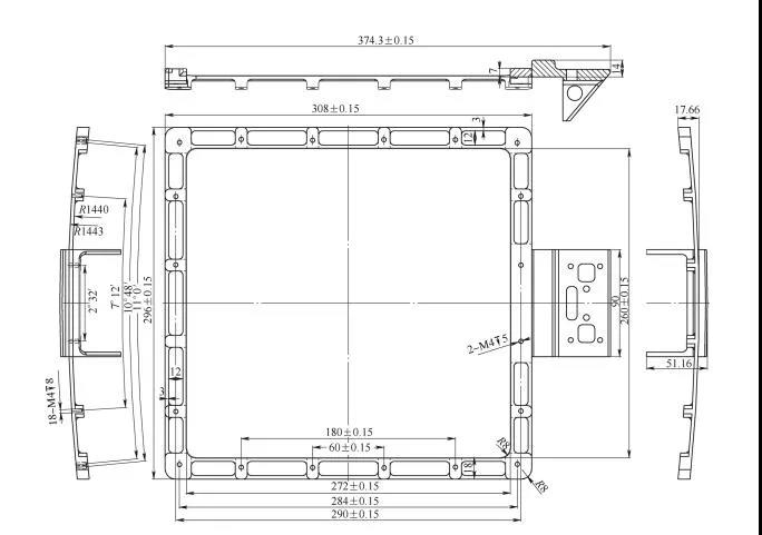 框架零件材料為TC4 鈦合金,其結(jié)構(gòu)及尺寸如圖2所示,長 374 . 3mm 、寬 296mm 、厚51.16mm,是我公司最大的鈦合金零件。其壁厚最薄處為3mm,外形為R1 443mm大圓弧曲面,形狀復(fù)雜。鈦合金本身為難加工材料,整體加工容易變形,而且費(fèi)用很高,加工周期長,影響產(chǎn)品交貨周期。原加工工藝的難點(diǎn)在于零件變形的控制,以及加工周期長、材料利用率低和加工費(fèi)用高等問題。